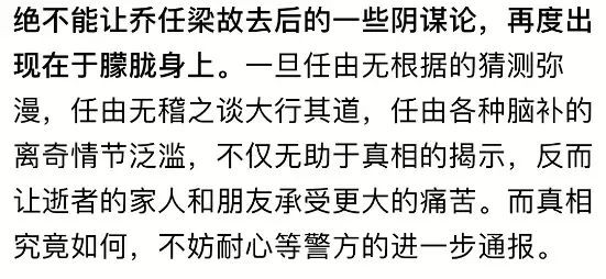 此前乔任梁去世后便涌现出很多阴谋论,扰乱了逝者家属的生活。即便乔任梁父母再三澄清,谣言依然不绝于耳。这一次,阴谋论再一次出现在于朦胧身上,甚至牵连到他身边人。