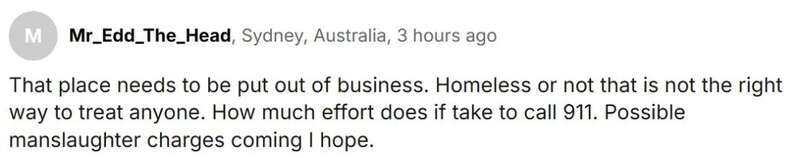 “应该把那家店封了。不管是不是流浪汉,用这种方式对待任何人都是不对的,打个报警电话能费多大力气啊?希望会有人被指控过失杀人。”