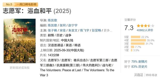 档期内上映影片票房相对较高的《志愿军:浴血和平》(豆瓣评分7.3)是国庆档最“佳”。