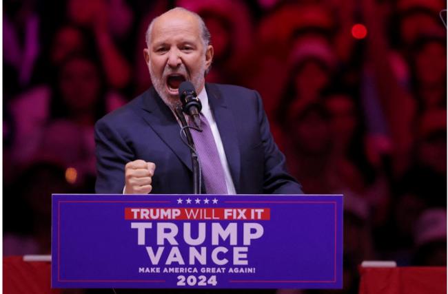 图为2024年10月27日,卢特尼克(Howard Lutnick)在川普集会上造势。卢特尼克于1961年7月14日出生于美国纽约州长岛一个犹太家庭。在911袭击事件中,包括他兄弟在内的658名员工丧生,而卢特尼克在随后世界贸易中心双子塔倒塌的事件中幸存了下来。从2019年开始,多次为川普举办了筹款活动从而赢得信任。(Reuters)