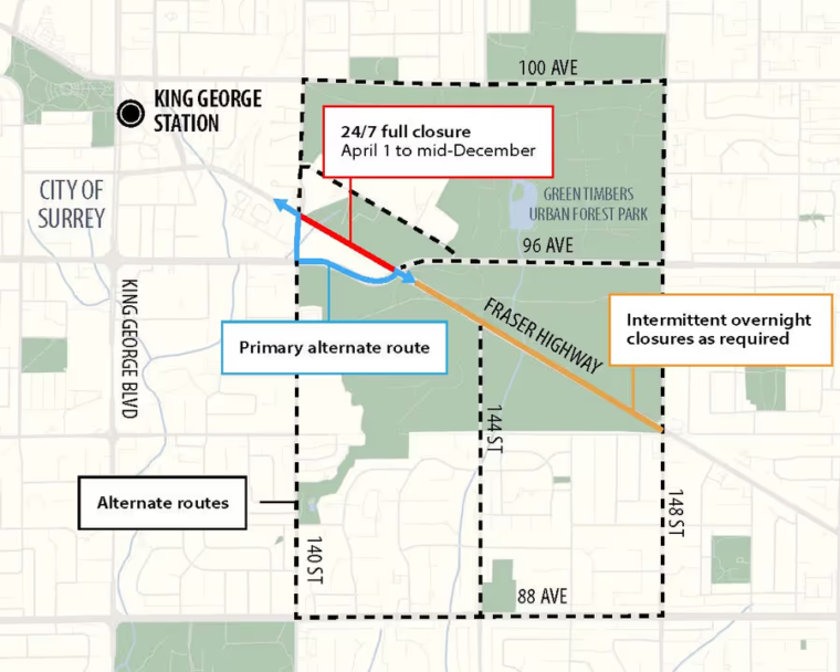 市政府此前指出,菲沙高速公路(Fraser Highway)位于绿木区(Green Timbers)的路段每天约有2.8万辆汽车通过。封闭期间,车辆将被引导绕行。