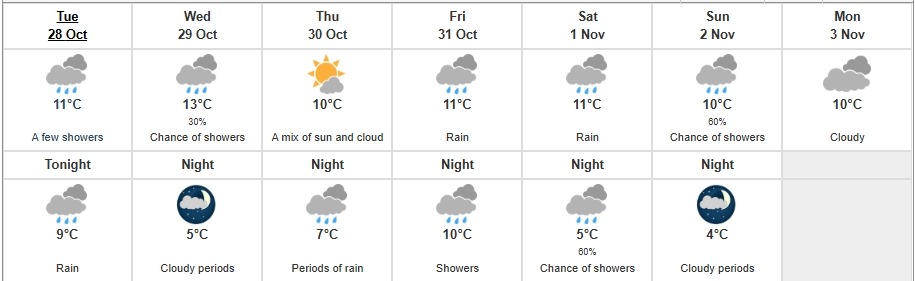 根据V.I.A.的报道,加拿大环境部气象学家 Derek Lee 表示:“今天(10月28日,周二)由于太平洋系统经过,大温地区将出现持续降雨。预计下午阵雨转为连续降雨,总降水量约 15 到 25 毫米”。