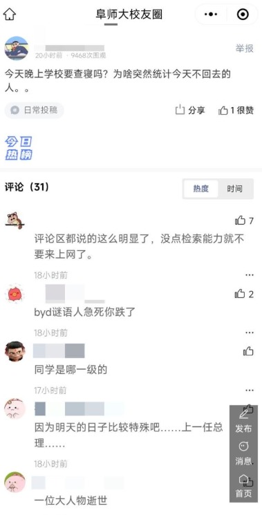 据“阜师大校友圈”聊天截图内容显示,有人问:“今天晚上学校要查寝吗?为啥统计今天不回去的人?”有人回答:“因为明天的日子比较特殊吧……上一任总理”、“一位大人物去世”。