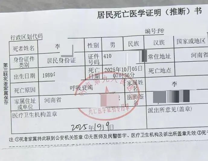 4日6时50分,患者出现呼吸暂停、意识丧失、呼之不应,后进ICU进行抢救。4日6时55分,医院下达病危病重通知书。医院出具的“居民死亡医学证明(推断)书”显示,李江的死亡日期为2025年10月5日7时36分,死亡原因为呼吸衰竭。