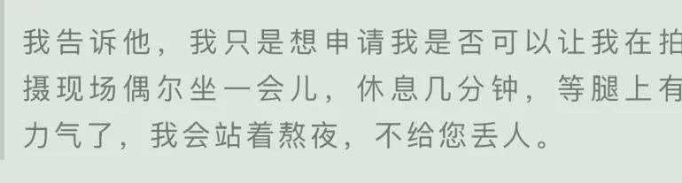 “我只是想在拍摄现场偶尔坐一会儿,等腿上有力气了,我会站着熬夜,不给您丢人。”