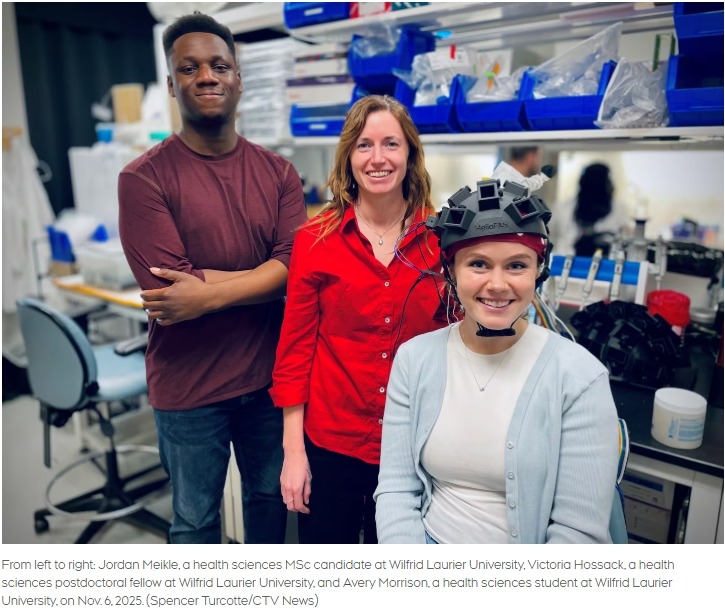 下圖從左到右依次為:威爾弗裡德·勞裡埃大學健康科學碩士研究生喬丹·邁克爾(Jordan Meikle)、健康科學博士後研究員維多利亞·霍薩克(Victoria Hossack)、以及健康科學本科生艾弗裡·莫裡森(Avery Morrison)。