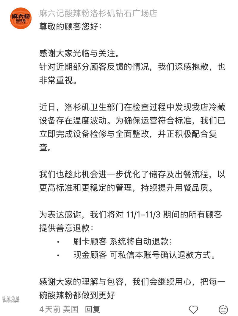 南都湾财社记者注意到,在多篇消费者投诉的帖子下方,一个名为“麻六记酸辣粉洛杉矶钻石广场店”的账号留言表示,针对近期部分顾客反馈的情况深感歉意、十分重视,并称将对11月1日至11月3日期间的所有顾客提供善意退款。
