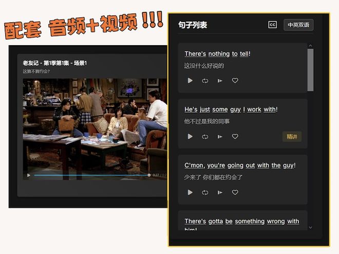 通过「单句循环」、「变速播放」和「实时跟读」,让你彻底攻克钱德勒的毒舌与菲比的怪调。