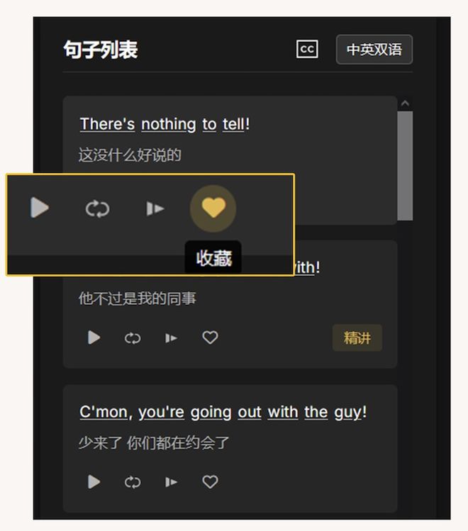 还可以「中英双语-仅英语-无字幕」自行切换,喜欢的句子还能收藏起来??。