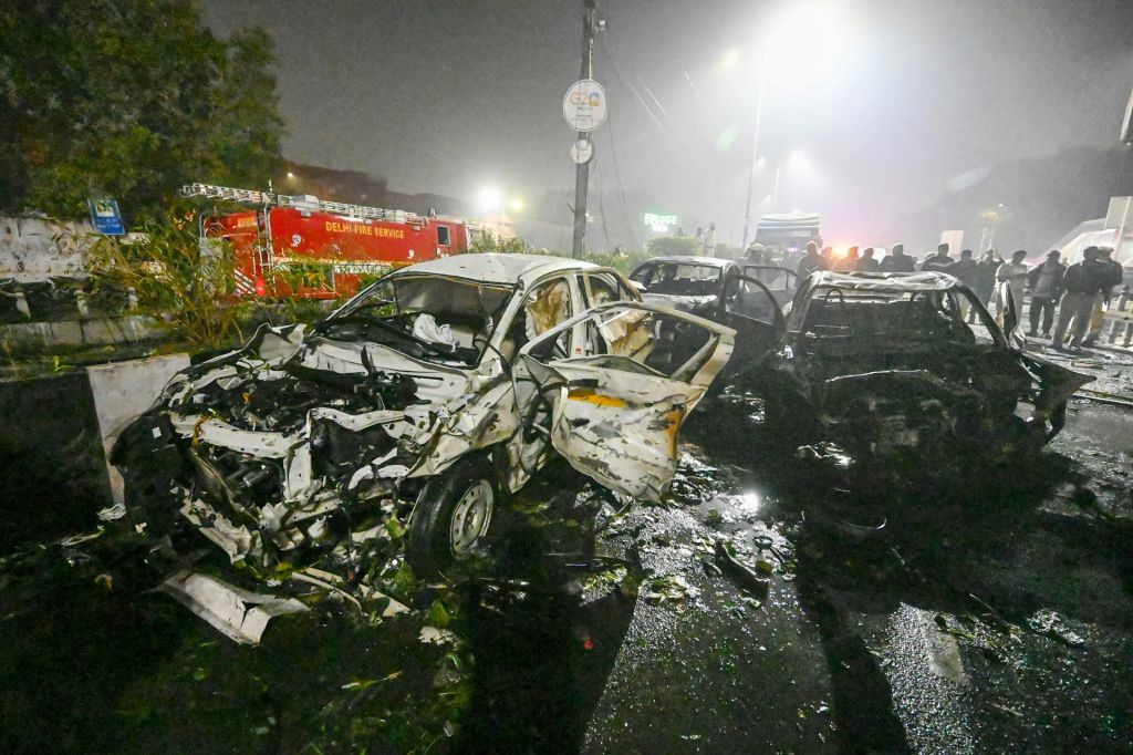 图为2025年11月10日,印度新德里红堡(Red Fort)附近地铁站外发生爆炸,现场多辆汽车遭波及。(Getty Images)