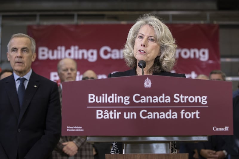 2025 年 9 月 11 日星期四,在埃德蒙顿宣布五个重大项目时,新联邦政府重大项目办公室负责人道恩·法雷尔 (Dawn Farrell) 在总理马克·卡尼 (Mark Carney) 的注视下发表讲话。
