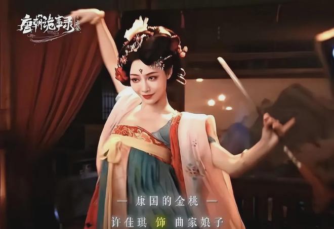 曲家娘子出现在第一个案子《康国的金桃》,她用的平康坊绝美舞姬的脸,妩媚勾魂的她被商人看中,花钱在百变郎君那里割皮买来。许佳琪几分钟戏份,但异域风情装扮让人眼前一亮,一镜到底的舞姿也是绝美,柔韧性强,舞姿轻盈,眼神勾魂,真是视觉盛宴。
