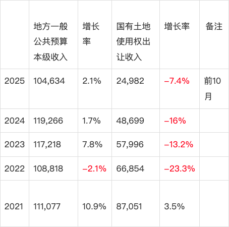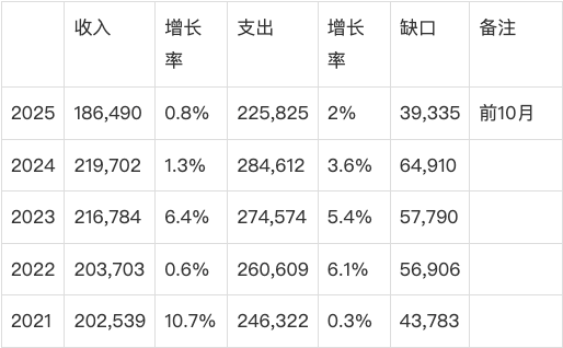 全国一般公共预算收入呢?从表2可知,2021年至2025年(前10月)的增速,分别为10.7%、0.6%、6.4%、1.3%、0.8%,显著低于同期GDP增速。2021年,全国一般公共预算收入为202.539亿元;2024年为219,702亿元,仅为2021年的1.08倍。
