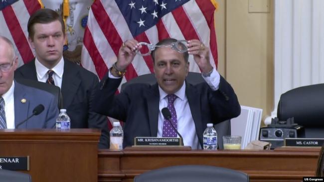 美国众议院中共问题特设委员会资深成员、民主党众议员拉贾·克里希纳莫蒂在听证会上举着一副手铐说明中国稀土垄断对美国的威胁。(2025年11月19日)