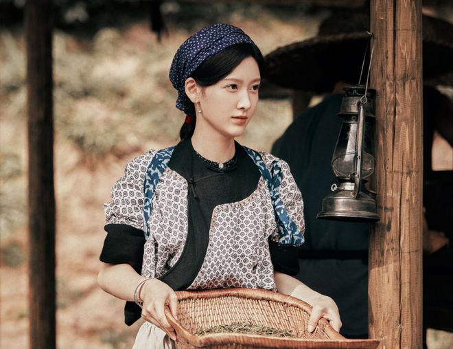 深色的头巾包住长发,宽大的衣袖被一根绳子束在身后,捧着一篮茶叶,干练利落。