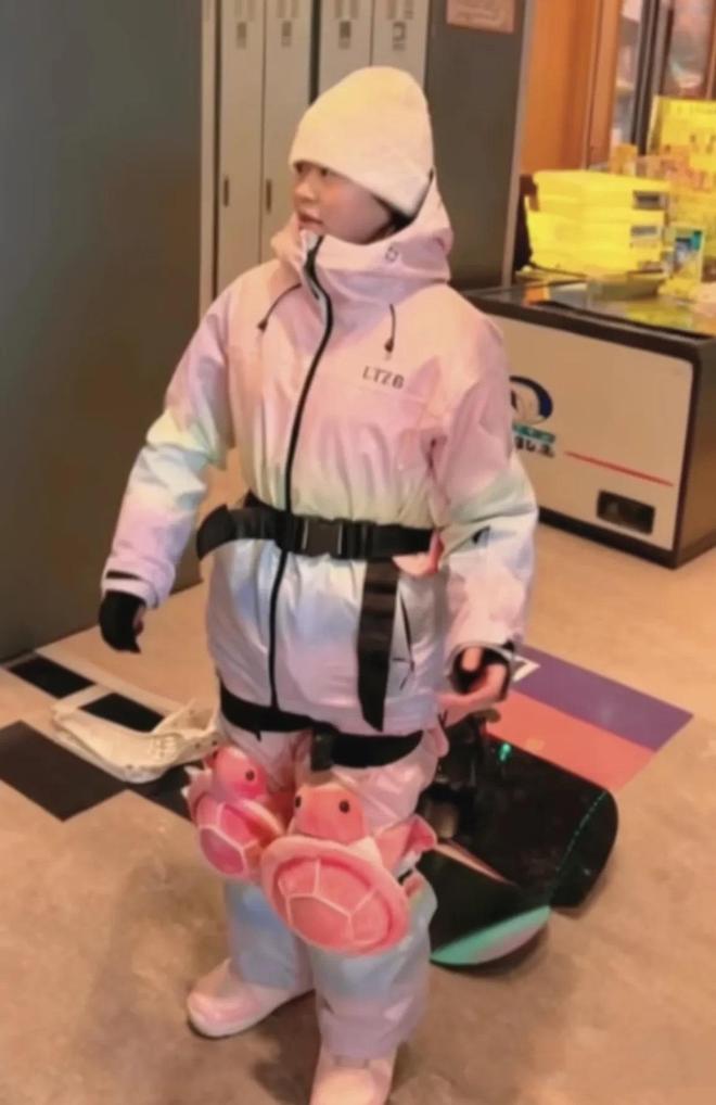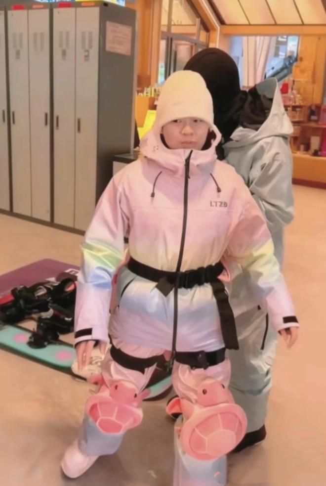 虽然全红婵已经18岁了,可是在滑雪教练跟前,还是小小的、看起来就像个孩子。因为是初次尝试滑雪运动,全红婵也是坐在了准备。双腿的膝盖上都裹裹着小乌龟的垫子,屁股上也是小乌龟垫子。