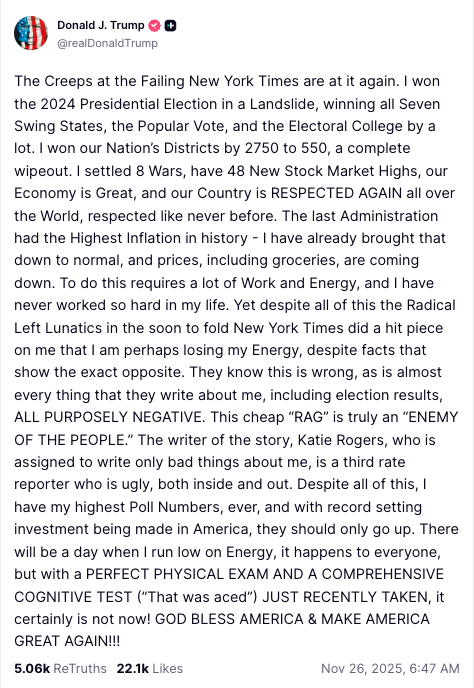 川普则在“真实社群”(Truth Social)上反击,先列出他自豪的政绩,包括2024年总统大选“压倒性胜利”、经济表现亮眼、股市刷新多项新高等,强调这些工作量需要极高精力,他“这辈子从没这么拼命过”。他怒批《纽时》刻意抹黑,把所有与他相关的内容都写成负面,并再次称其为“廉价烂报”。