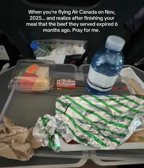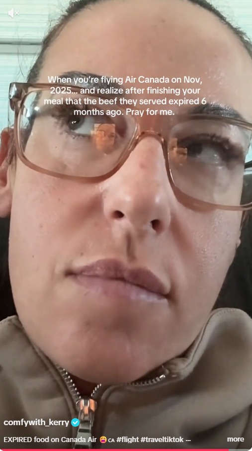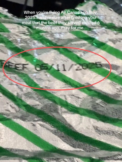 她气愤地说:“当你在2025年11月搭加拿大航空时……吃完才发现牛肉六个月前就过期了!为我祈祷吧!”