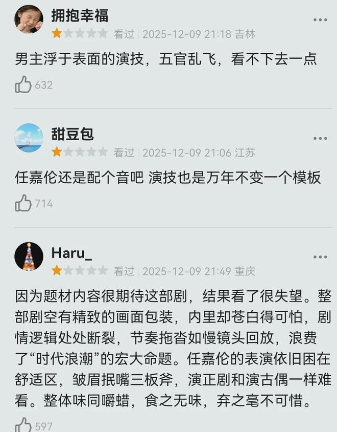 当然争议也不是没有,该剧开播就有不少豆瓣一星差评,有人质疑任嘉伦的原声台词功底,也有人觉得“主角光环有点强”(不过这点我倒觉得不是毛病,因为原型就是这么厉害)。