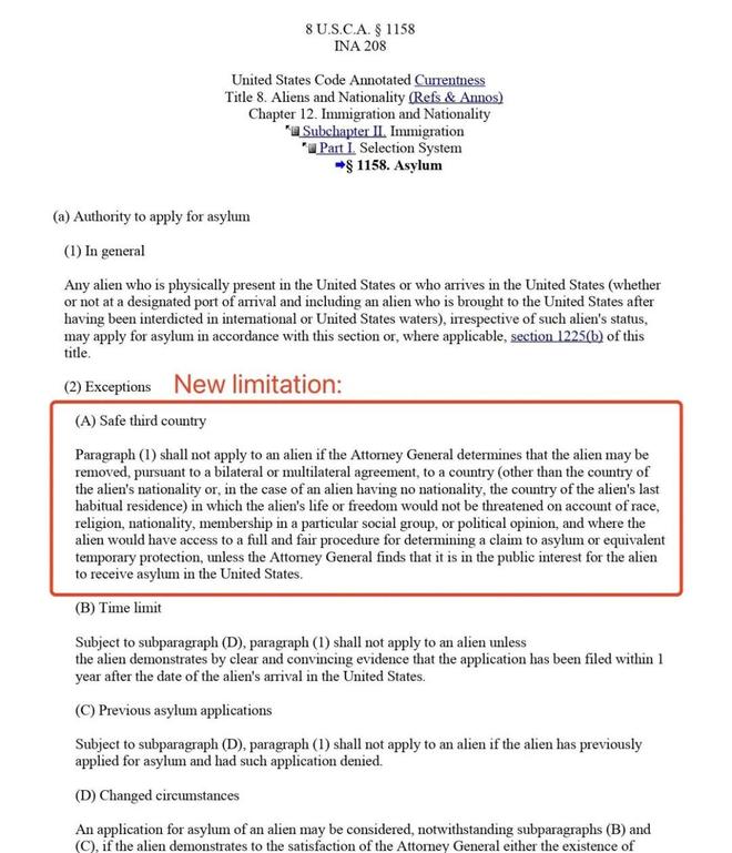 网上传得最多的是这份法律文件,文件显示,根据《移民与国籍法》(Immigration and Nationality Act,INA)第208条最新被强调适用的条款,美国国土安全部(DHS)正越来越多地援引所谓的“第三安全国”(Safe Third Country)规则,要求移民法官直接终止审理BH(庇护)申请,而不再进入实体审查阶段。