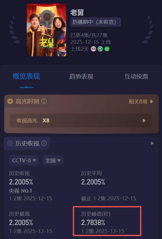 《老舅》首播,收视率破2.7,冲上全国收视第一,热度势头迅猛。