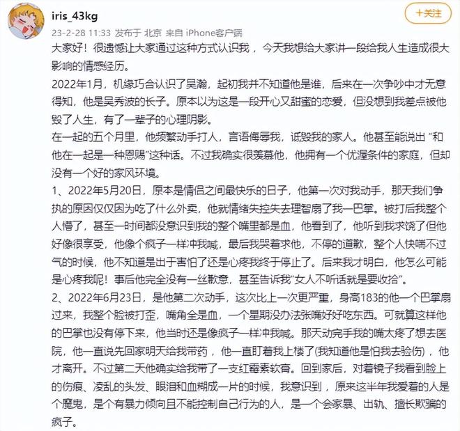该女子和当年的陈昱霖一样的操作模式,她发长文控诉吴瀚。