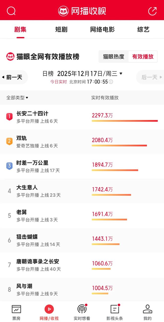 这部古装剧凭借高能剧情的爽感、戏骨飙戏的张力、实景拍摄的沉浸感,开播后便强势霸榜。央视八套第一集首播时收视率即破2%,拿下当晚收视冠军。猫眼全网有效播放实时登顶No.1,猫眼角色热度榜拿下冠军,截至12月15日中午,优酷站内热度也突破了9500。