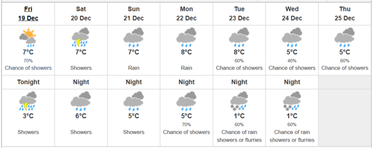 溫哥華七天天氣預報,來源:加拿大環境及氣候變化部)