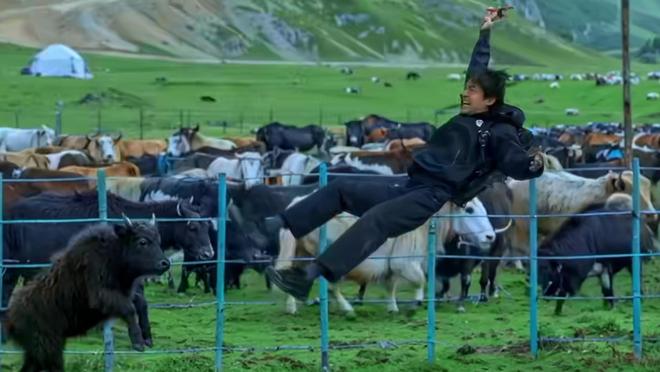 张招远(胡歌 饰)来到高原上推广牦牛险,正要给一头小牛打上耳标的时候,只见一、二、三,小牛战术性后撤,随即一记势大力沉的牛头冲击,张招远原地起飞。