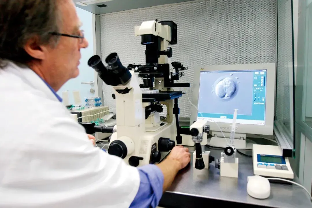 法國一家精子銀行內,工作人員通過顯微鏡觀察人類胚胎。圖/視覺中國