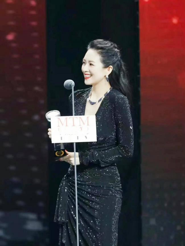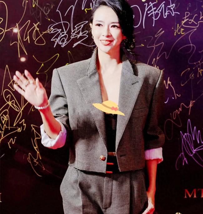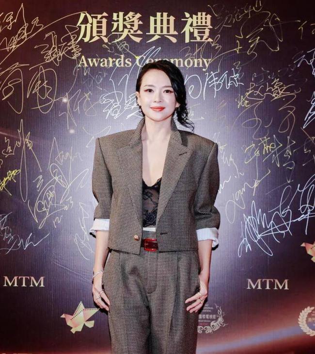走上領獎台時,章子怡更是打破常規,摒棄了高跟鞋的加持,腳踩一雙黑色平底鞋,步履輕盈,姿態舒展,全然不似在領獎,反倒有種“久在樊籠裡,復得返自然”的松弛感。細心的觀眾不難發現,她身上的西裝外套長度稍短,恰好露出腰線,而西裝褲即便挽起一截,依舊顯得有些過長。