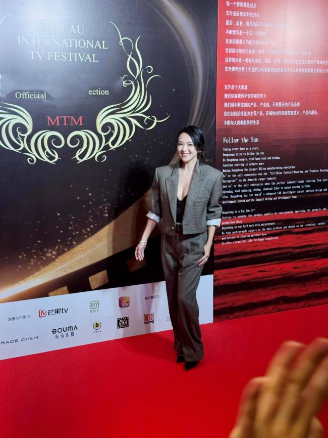 走上領獎台時,章子怡更是打破常規,摒棄了高跟鞋的加持,腳踩一雙黑色平底鞋,步履輕盈,姿態舒展,全然不似在領獎,反倒有種“久在樊籠裡,復得返自然”的松弛感。細心的觀眾不難發現,她身上的西裝外套長度稍短,恰好露出腰線,而西裝褲即便挽起一截,依舊顯得有些過長。