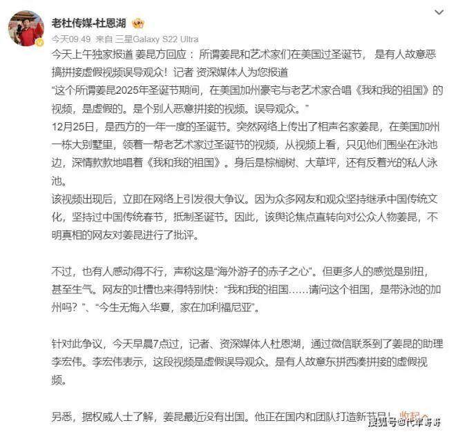 这几天,一段“姜昆美国加州豪宅泳池边领唱《我和我的祖国》”的视频突然在网络走红,并迅速引发激烈争议。