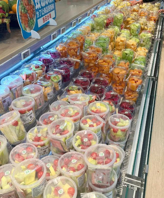 很多超市專門設立水果加工間,把賣相不好的水果制作成拼盤。