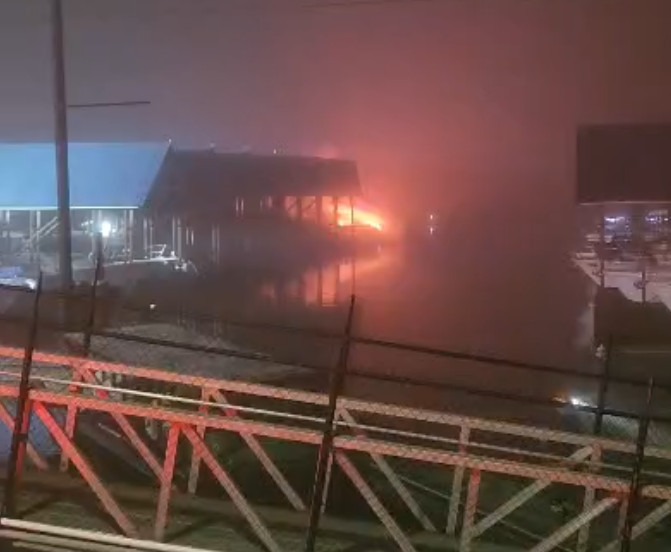 周六清晨,停泊在穆迪港里德角码头的多艘船只发生火灾。(穆迪港警察局提供的视频截图)