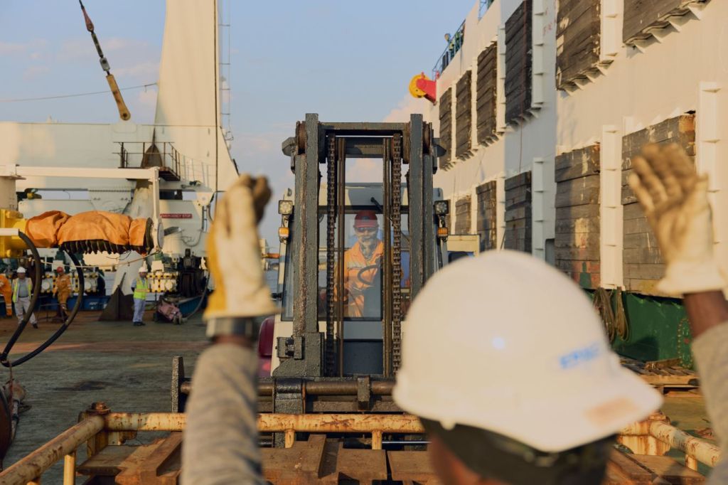 工人花一个周末的时间卸下了格尔夫波特港的起重机。船员们用割炬切开紧固件,松开缆绳,岸上的工人则在码头上铺设了临时轨道。他们用绞车系统将起重机从船上拉下来,同时一名船员调整船上的压载物,以确保船体与码头齐平。
