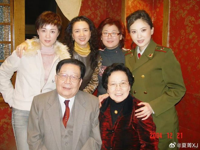 2004年,陶慧敏的演唱會上,《紅樓夢》劇組重聚,圖為謝鐵驪導演和他的夫人王遐,後排是傅藝偉、何晴、夏菁、陶慧敏。那時候,傅藝偉40歲,何晴40歲,夏菁36歲,陶慧敏38歲。