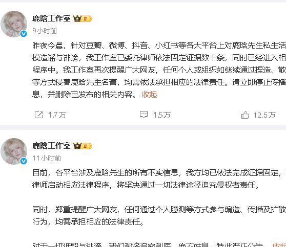 1月3日上午,第一轮反击就来了,而且不是靠粉丝吵架,是工作室下场。鹿晗工作室最先给出正式辟谣声明,明确表示相关内容不实,已固定证据并启动法律程序。