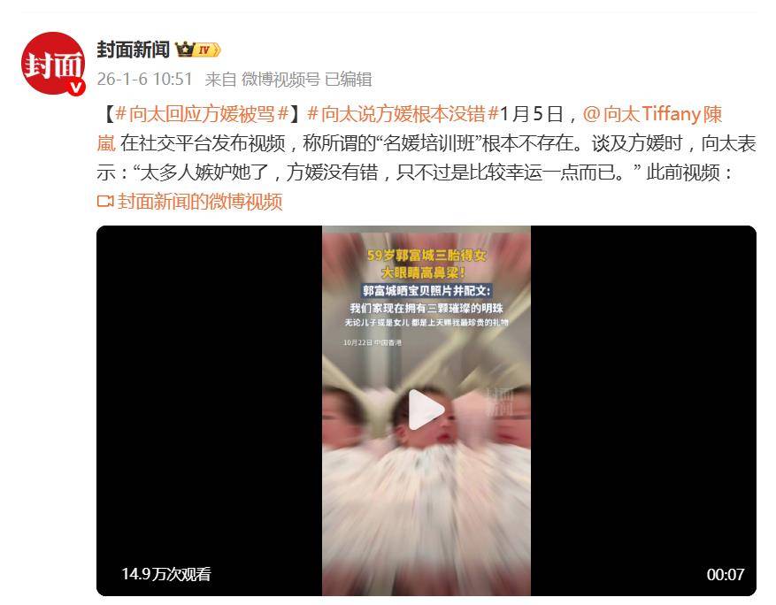 一句“方媛沒有錯”,讓向太陳嵐沖上熱搜。據1月6日報道,向太在社交平台發布視頻,火力全開,為郭富城的妻子方媛強勢辯護,矛頭直指那些給她貼上“撈女”標簽和炒作“名媛培訓班”傳聞的網絡惡評,核心結論就一句:太多人嫉妒她了。