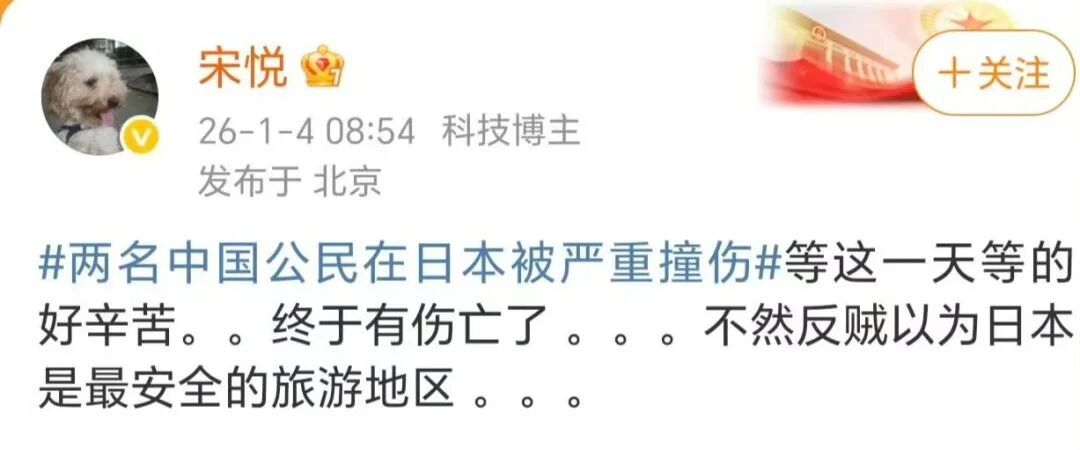 兩名國人在日本被撞傷了,結果這個大v的心態確實,等這一天等得好辛苦,終於有傷亡了,不然反賊以為日本是最安全的旅游地區。