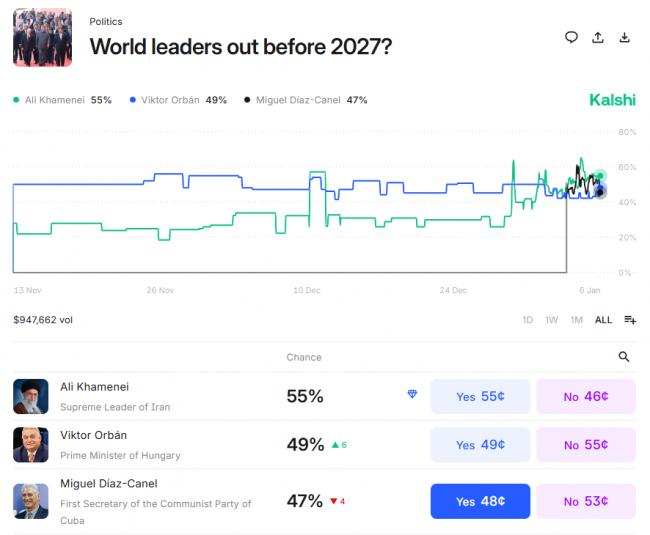此外,Kalshi交易员还在本周末开始押注伊朗最高领袖哈梅内伊是否会在明年之前离任。该市场押注规模接近100万美元,周二该事件的隐含概率约为55%。