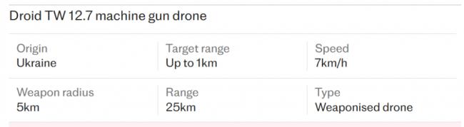 上图是DevDroid TW 12.7的基本参数。这家伙的作战射程可达25公里,主要通过无线电信号远程控制,使乌克兰操作员能够在安全距离内引导其行动。