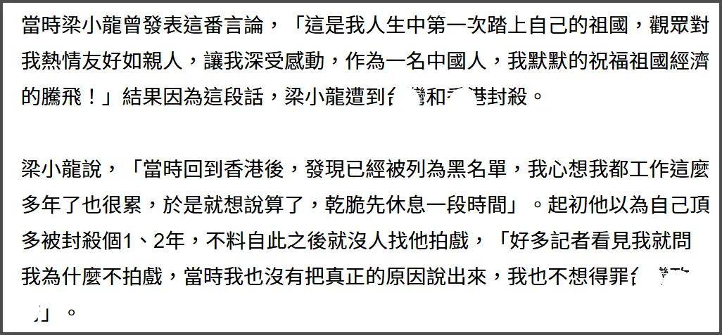 可能是有钱了就想投资做生意,梁小龙80年代的时候经人介绍到内地经商,息影将近20年,因为初到内地说了“这是我人生中第一次踏上自己的祖国,观众对我热情友好如亲人,让我深受感动,作为一名中国人,我默默祝福祖国经济腾飞!”就被当时的台湾(专题)省当局拉进黑名单,梁小龙拒绝签悔过书,直接被封杀20年。