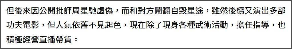 如果不是2004年周星驰要拍《功夫》找到他,不知道他还有多久才能复出。不过梁小龙和周星驰的关系也不是很好,两人当年也闹翻过,据悉是因为梁小龙感觉周星驰不太尊重他,片酬也不太满意,所以后来几乎没有往来合作了,令观众遗憾。