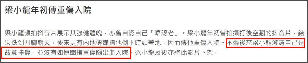但也有翻车的时候,此前梁小龙在短视频平台拍摄视频,曾在公园表演后空翻摔倒,还被传伤重住院,不过后来梁小龙现身澄清说自己是故意摔倒,并不是像传闻所说的那样。