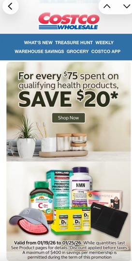 Costco加拿大正在推出 購買保健品“滿額立減(Spend & Save)”的優惠,符合條件的藥房商品(包括非處方藥、維生素及居家健康護理用品)可享受“消費滿75加元立減20加元”的折扣,進一步提升性價比。
