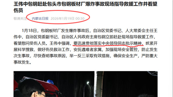 2026年1月19日凌晨零点30分,内蒙古日报社融媒体发布一份原创稿件,标题为“王伟中包钢赶赴包头市包钢板材厂爆炸事故现场指导救援工作并看望伤员”,文章在导语之后,紧接着称:“王伟忠强调,要迅速贯彻落实中央领导同志批示精神”;2026年1月19日8点38分37秒,新华社注明来源:内蒙古日报,依样画葫芦,标题不变:“王伟中包钢赶赴包头市包钢板材厂爆炸事故现场指导救援工作并看望伤员”,但文章内容只有一点变化:“王伟中强调,要迅速贯彻落实蔡奇同志批示精神”。