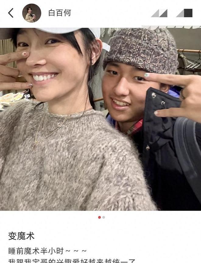 那晚她发的照片,光线特别柔和。 白百何戴着一顶浅灰色棒球帽,咧着嘴笑,眼角弯弯的,还是当年《失恋33天》里黄小仙那股子灵动劲儿。 她配的文字挺有意思,说现在儿子跟她的爱好越来越同步了,晚上能一起琢磨半小时魔术。 玩高兴了,就拍下了这组合影。 字里行间,没有一丝“为孩子牺牲”的苦情,倒像在炫耀一个能玩到一块去的挚友。