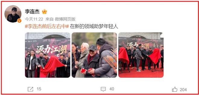 在开机仪式结束后,李连杰还专门发布了一条有关《源力江湖》的开机仪式的动态,他在文案中写道:在新的领域助梦年轻人。