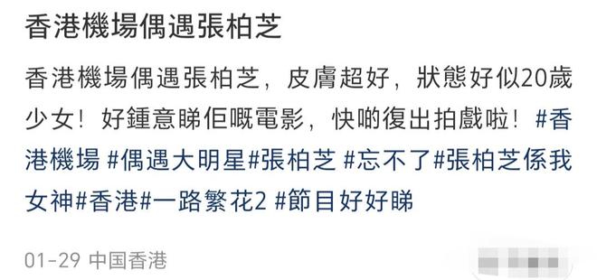 同月29日,又有網友在香港機場碰到她,誇她皮膚好,狀態像20歲少女。網友還分享了照片。照片裡,她長發披肩,看起來又黑又柔順,戴了眼鏡和口罩,一身打扮樸素,身穿白色毛毛外套,下搭黑色打底褲,腳穿白色厚底鞋,手上掛著一個袋子,還推著一個行李箱。